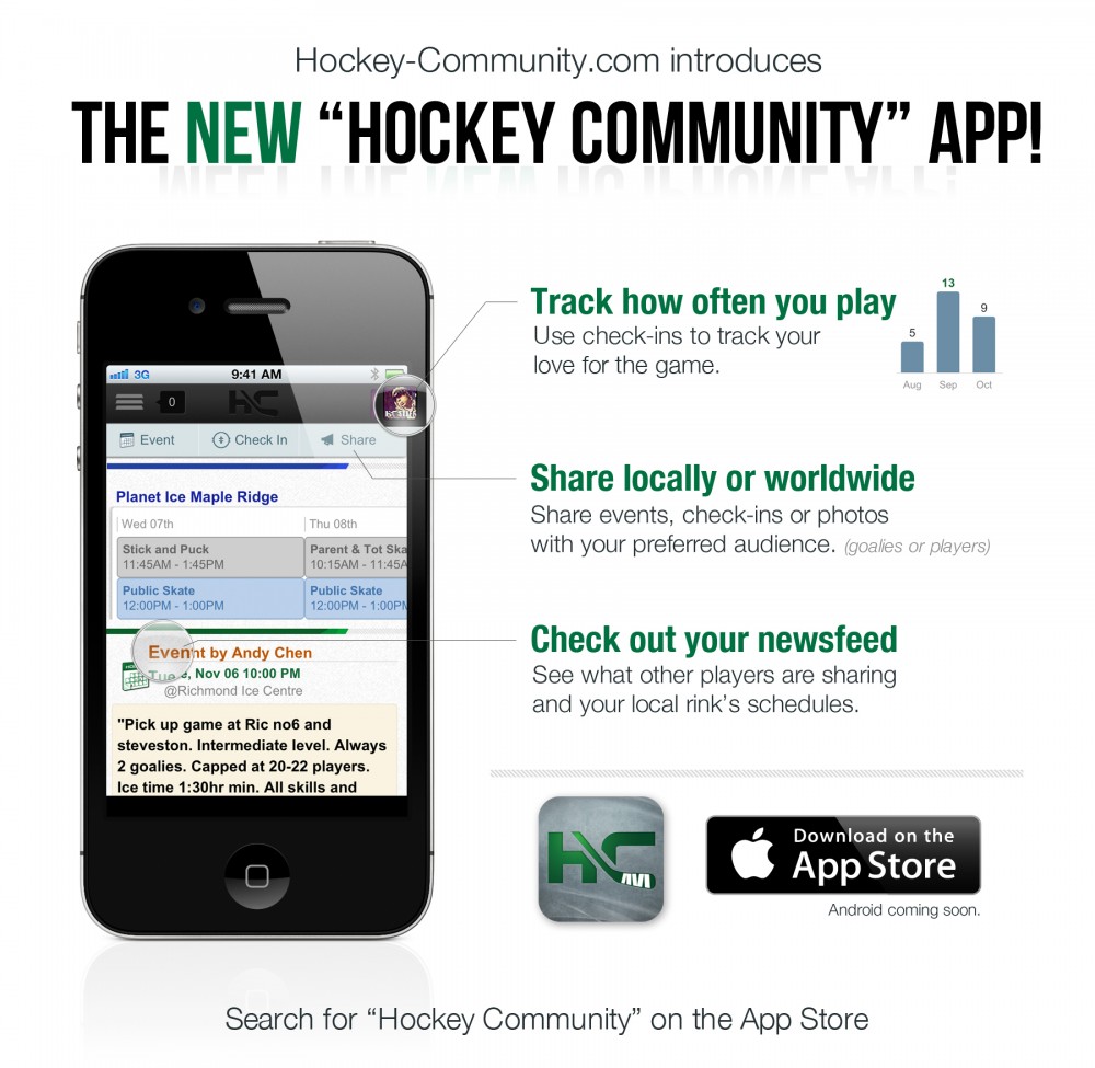 Hockey Community, a Vancouver-based start-up has released their new iPhone app last Wednesday. It allows you to connect with players worldwide as well as help players track and flaunt their practice frequency among many other features.