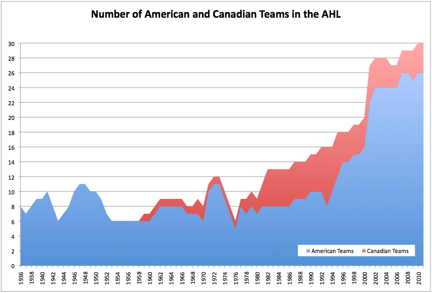 In 1993, fully half of the AHL’s 16 teams were located north of the border, but that total had shrunk to three by 2005.