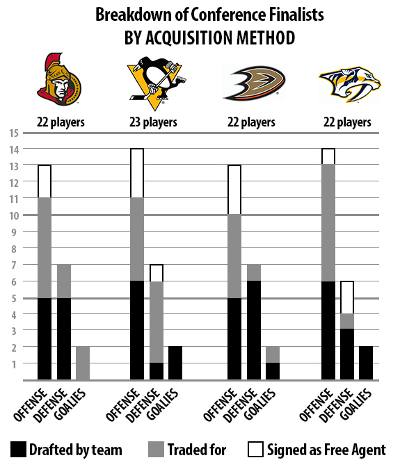 - Ottawa and Anaheim have drafted most of their defensemen, while Pittsburgh has traded for most of theirs.