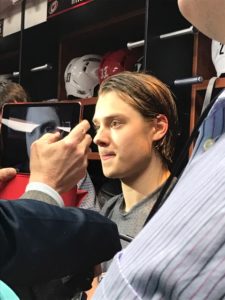 After the game in the Canes’ locker room, Aho was surrounded by the media. When the crowd thinned I asked him how it felt to get his first NHL hat trick. Aho said, “It’s pretty nice. I haven’t scored a hat trick as a pro. Maybe last time in B-juniors so it was a long time ago and it feels nice.”