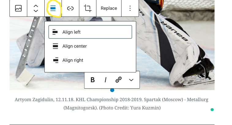 Once the image is placed, click on it and a popup menu will appear. This is how you align images. Click the icon that’s circled and a drop down menu will appear. Click on the center align option. That’s how we like all images to be placed.