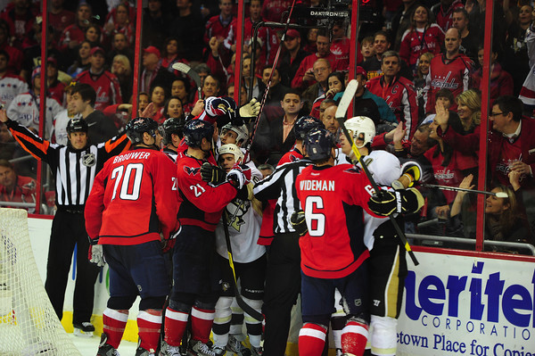 After the goal, John Erskine instantly dropped the gloves had a bout with Arron Asham, the one whose knockout punch in a fight with Jay Beagle last meeting gave Beagle a concussion. The fight led to a fury of hits by Washington, but the Penguins continued to have control of the flow of the game, assisted by a power play.