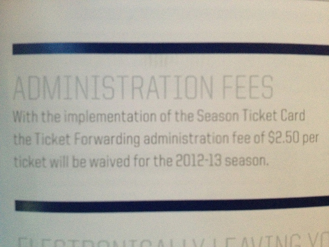 Jim Ludlow, President and Chief Executive Officer or TNSE, held a press conference this morning addressing many issues, some positive but more importantly the dreaded $2.50 fee. In his presser he apologized for confusion and said that it was not certain that the fee would be continued on past this season. Even though you can see the fee and the statement “waived for the 2012-13 season” printed three separate times. If a person holds 4 tickets in their name and has to distribute 3 to each game to the group he is in for a regular season, plus playoffs, the fee adds up to 2.50 x 45 x 3= $337.50 extra. No imagine if that happened thousands of times?