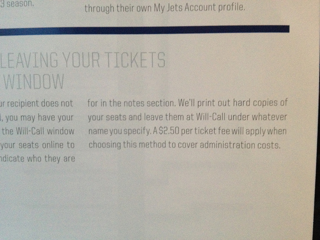 There of course was a solution to the ticket distribution problem and that was laid out in the accompanying book that came with the cards. A seat holder could e-mail or print his or her ticket by entering their account with Jets and choosing the particular game. While printed paper tickets present a nostalgic and tangible keepsake for fans the white paper with bar-code and ads was far from desirable, it was not the crux of the controversy. The associated $2.50 charge that came with emailing and printing the ticket did as well as being charged the same amount to resell the ticket on the Jets own ticket exchange board.