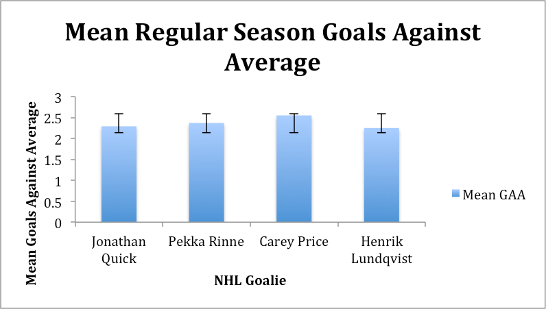 In addition to Jonathan Quick, the names mentioned amongst the NHL’s top goalies include Carey Price, Henrik Lundqvist, and Pekka Rinne. To draw comparisons, each goalie will be looked at as elite given his regular season mean save percentage, mean goals against average, and mean winning percentage (games won/games played). These four goalies have played five or more seasons playing thirty-five games or more. Thus excluding other goalies that can be thought of as elite like Corey Crawford, Cory Schneider, and Tuukka Rask.