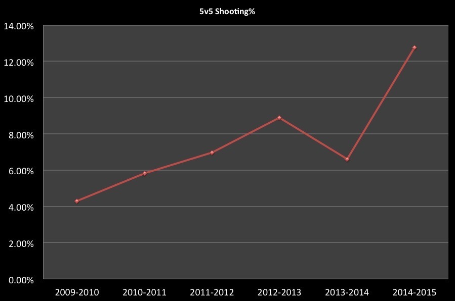 In fact, Abdelkader’s shots/60, scoring chances/60, and shot attempts/60 are all at career lows this season, but his shooting percentage at all situations is more than double his career shooting percentage.