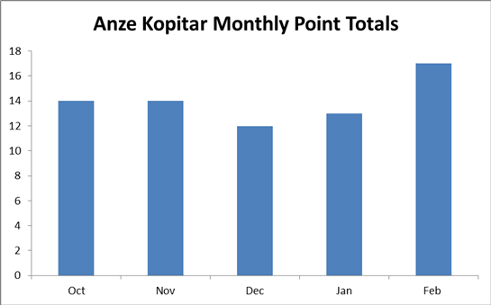 The Kings captain started off the 2017-18 season with a blistering 14 points in 12 games during the month of October. It’s not a surprise that the team won nine of those games. Over the subsequent four months, Kopitar has managed to sustain this prolific rate: