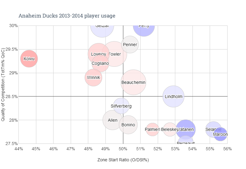 You’ll see Koivu on the far left, which represents how much more he started action in Anaheim’s defensive zone. However, lost in the Ducks’ conference-pacing regular season was some deterioration in his game: