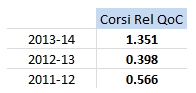 (Corsi Relative Quality of Competition compares 5v5 Even Strength all shots attempted versus shots against when a player is on the ice, relative to teammates and opposition.)