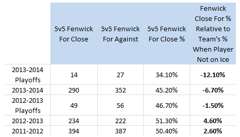 (Fenwick Close For/Against measures unblocked shots by a player or team in “close” game situations where the score is tied in any period or within one goal in the first or second periods. This helps remove score effects, which are the result of a team in a defensive shell or gambling to score goals.)