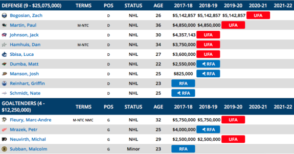 There is not much available here from Boston with their star players protected. I’ve gone with former first round goaltender Malcolm Subban. He has shown flashes of talent in the AHL and had his year cut short by injury. His $0.863 salary helps Vegas stay within the $75 million cap.