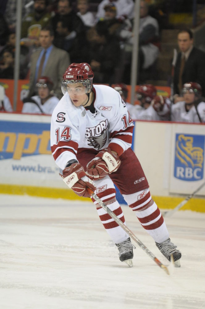 2007-08, however, was going to be a defining season for Salters. With many of their offensive stars on the cusp of graduation, the now 6’4″, 225-pound third-year winger was expected to chip in on the scoresheet more than he had in the last two seasons. This was also even more intensified by the Storm drafting and signing two highly-touted 2007 draft picks, Peter Holland (11th overall) and Taylor Beck (31st overall). As well, Guelph acquired Derek Brochu from the Owen Sound Attack and second-year forward Brandon Buck was on pace for a breakout season. In only the third game of the season, on September 30, 2007, against his hometown team, the London Knights, Salters scored his first goal of the campaign. Two games later, on October 6, 2007, against the Owen Sound Attack, he scored his second. It seemed as if this was going to be his best offensive season yet. Fifteen days passed and he enjoyed another first, his first two-goal game in the OHL. He scored two powerplay goals in a 6-5 loss against the Kitchener Rangers. His physical play, however, did not suffer; he recorded 19 penalty minutes in 11 games in October 2007, including his first fight of the season on the 26th of that month against Brampton Battalion captain John de Gray.