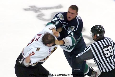 In 13 games in November 2011, Salters recorded nine points, six goals and three assists. He also recorded 18 penalty minutes during that time period. While December started a bit slowly, things picked up toward the end of the month. On December 23rd, he scored two goals in a 6-3 win over the Trenton Titans and he was named second star. Eight days later, on New Year’s Eve, he scored a goal and two assists in a 6-3 victory over the South Carolina Stingrays. His truculence did not suffer either, registering 18 penalty minutes in December alone. He went into 2012 with 19 points (11 goals, eight assists) and 47 penalty minutes in only 29 games.