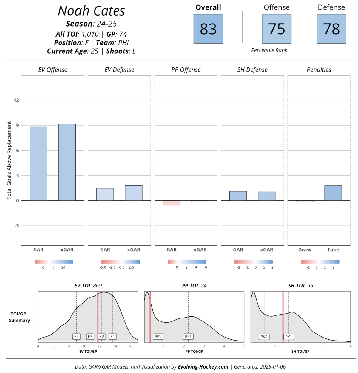 Cates sits third on the Flyers in expected goals above replacement (xGAR) among forwards, trailing only star winger Travis Konecny and breakout 22-year-old Tyson Foerster. He is first among Flyers forwards in GAR with a 50.99% expected goals share (xGF%), 50.31% shot attempt share (CF%), and 53.25% high-danger chance share (HDCF%) – by just about all advanced statistics, Cates lies above the mean. He’s blossomed into a terrific player.