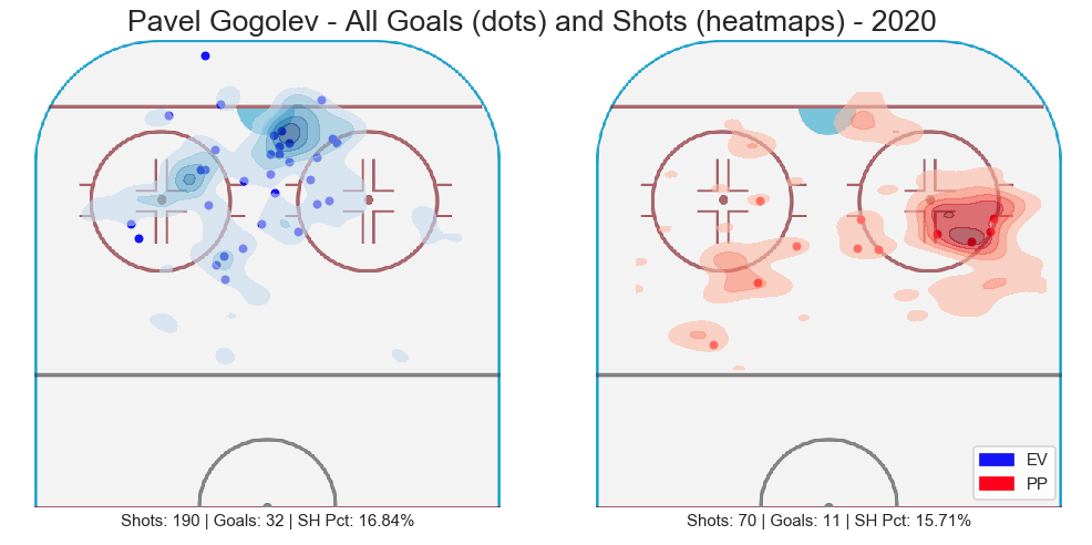 Even looking at his shot selection from 2019-20, you can tell where he likes to do most of his damage. At even strength he’s a factor all over the place in the middle of the ice, making those hard-nose plays to the net. On the power play, he likes to set up shop on the right side as majority of his shots and goals came from that side.