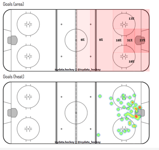 Here are goal maps from 2016 and 2019 from IcyData.hockey. The goal map from 2019 shows a significant difference from Matthews’ percentage and surface area used in 2016.