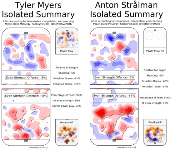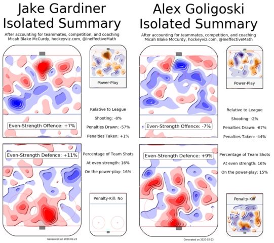 From these charts, all players mentioned above are worse than league average defensively (7%-11% worse), according to Micah’s model. With the exception of Gardiner, they are all worse than league average offensively, as well (3%-7% worse).