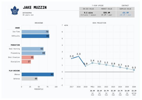 What Dom’s aging model does is attempt to predict how this number will change for players as they age. It shows that for Muzzin, he has already started to decline. However, his numbers are still quite good, and should be for the duration of his contract.