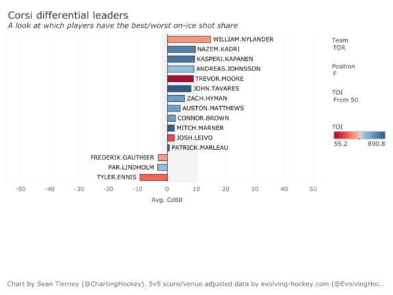 In the 12 games since, they have recorded 38.81 SCF/60 with Nylander on the ice at five-on-five, the third highest total for any forward in the NHL (minimum 140 minutes played). With Nylander averaging 12:30 of five-on-five ice-time per-game (TOI/GP), that’s the difference of roughly one scoring chance per contest when he’s on the ice.