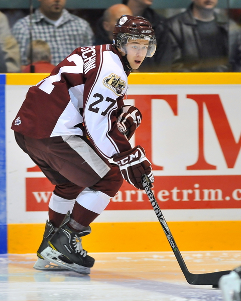 After he was signed to an OHL contract on August 27, 2010, Martschini’s arrival in Peterborough was immediately brought with curiosity and wonder. His smaller size made many wonder if, despite his obvious talent, that he would be able to physically thrive in a league with most players over six feet tall and over 200 pounds. He set out to prove that he belonged and that he would succeed. In his first OHL game on September 23, 2010, Martschini got an assist on a goal by Matt Puempel; the Petes, however, lost the game 5-4. He followed that up with his first goal of his OHL career a week later in a game against Tyson Teichmann of the Belleville Bulls, a game in which he also tallied two assists.