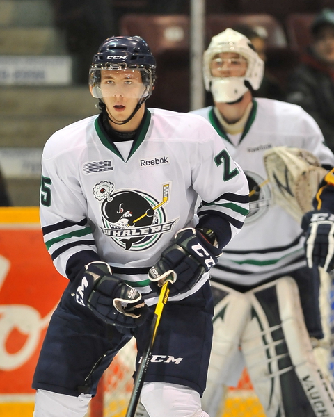 Trutmann returned for a second season with the Whalers in 2011-12, hoping to build upon what was a solid first year in the OHL. The first game of the year — September 21, 2011 — was a rematch against the Attack and the Whalers were still bitter about the sweep from the playoffs. Trutmann got into a fight with one of Owen Sound’s rookies, forward Devon Rymarchuk, who was playing in his first OHL career game. In October, Trutmann had one of his best goal-scoring months, scoring three goals in 13 games that month. As well, in October, he got a new defence partner; instead of playing with Dylan MacDonald, head coach Vellucci paired the young Swiss with third-year American stay-at-home blueliner Nick Malysa.