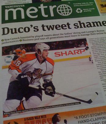 So what’s the big deal, you ask? Two teams swapped career minor leaguers – who cares, right? Pretty much true, until Mike Duco was outed in the Vancouver Sun for a series of posts he’d made to his Twitter account during the Canucks long playoff run. (Always timely, the free daily Vancouver Metro plastered the story on its front page, pictured above, two days later.) Stepping away from his annual pilgrimmage to local golf courses, Duco dragged his knuckles across his Blackberry keypad: he posted that he was “sick of watching the Sedins dive and lay on the ice”, then followed it up by taunting Vancouver’s #1 goalkeeper: “ha… solid night, Luongo.” Not exactly the kind of material that endears you to your new co-workers…