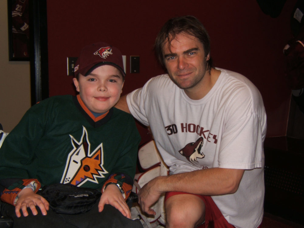 During the 2005-06 season I went to Phoenix with the Children’s Make a Wish Foundation to meet the Coyotes and Wayne Gretzky. Unfortunately, the day I went to the game was the day the Rick Tocchet gambling scandal hit. I had made it all the way to Phoenix to meet my all-time hockey idol and I couldn’t because of a silly scandal. I had even brought a birthday present for Wayne, a box of Tim Horton’s coffee and a card. To this day I have yet to meet him. It wasn’t all bad though. I had the opportunity to meet anyone I wanted on the Coyotes. I met Phil Sauvé, Oleg Saprykin, Tyson Nash, Ladislav Nagy, Mike Ricci, and many others. The highlight of the night was meeting Curtis Joseph, Mike Comrie and Shane Doan. I even got to wear Cujo’s mask. It was a dream come true, wearing the mask of one of my childhood idols. Ever since he was acquired by the Leafs, Joseph has been my favourite goalie.