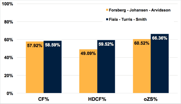 Here’s a quick look at their comparison to last season, using Corsi-for percentage (CF%), high-danger chance percentage (HDCF%), and offensive zone start percentage (oZS%):