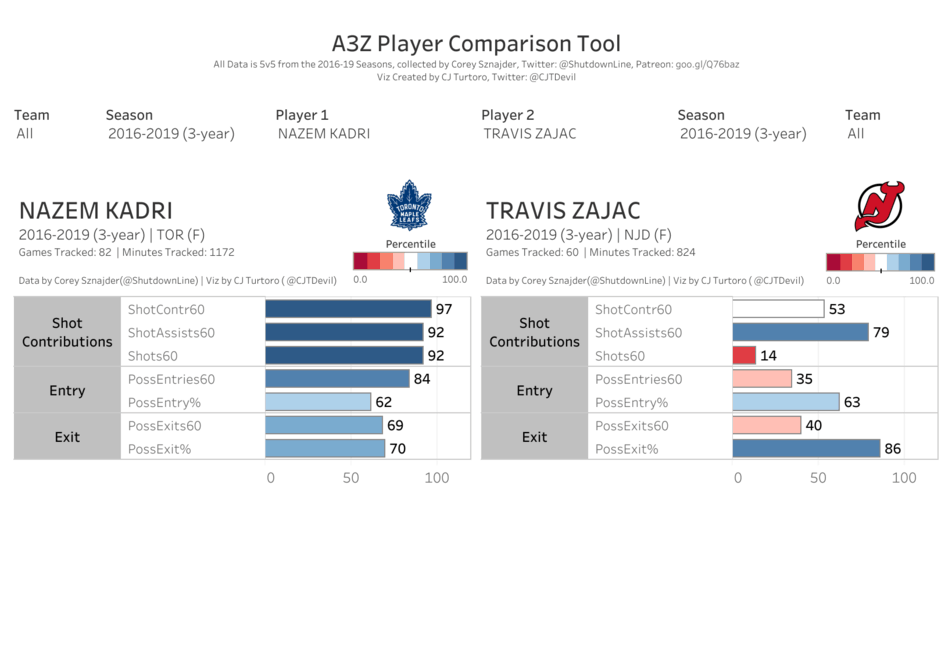 Over the past three seasons, Kadri has displayed the ability to enter the offensive zone with possession at a high rate, and he provides a significant impact on shot contributions, which leads to more offense. He also does a modest job of exiting his own defensive zone with possession. If slotted in on the Devils’ third line at center, they can bump Travis Zajac down to the fourth line and have a solid depth chart down the middle of Hischier, Hughes, Kadri, and Zajac.