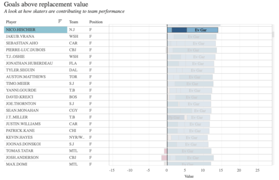 Another way to evaluate Hischier’s performance is by looking at goals above replacement (GAR), which measures how many goals a player adds to his team relative to a replacement-level player. He finished the season with a GAR of 14.4 at all strengths, putting him ahead of forwards like Jonathan Huberdeau, Tyler Seguin, and Auston Matthews.