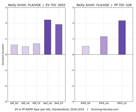 The chart does include Smith’s last season as a Panther (2016), but that doesn’t change much. He’s done well to create shot attempts (Off_CF) and expected goals (Off_xG), which has led to a positive impact on goals scored (Off_GF). But where he might not get as much attention is on defense as he’s done a great job preventing shot attempts (Def_CF) and expected goals (Def_xG).