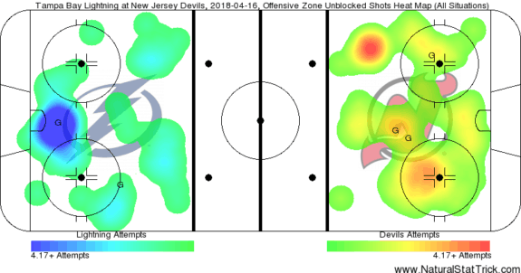 The way the map works is the darker the color is, the higher concentration of shot attempts. As you can see, the Lightning had most of their shot attempts come in the slot where the darker blue is most prevalent. Part of this was due to their power play, which was two for five on the night and generated four high-danger chances.