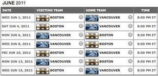 analysts to crunch some numbers. Go to nhl.com to look at your teams results from last year. Look a this years schedule against a 2011-2012 power ranking. Do it for your home team! The problem in the analysis is the regular season results are based on this unbalanced schedule so what is a true test of a team’s results? The most difficult division in the West could be argued to be the Pacific having teams that finished 5th, 9th, 11th, 12th, and 16th. But teams in this division got more games against the worst division, the North West (1st, 17th, 21st, 29th, 30th) than Eastern opponents. Based on the same rationale the best in the East was the Atlantic with 3rd, 4th, 18th, 23rd, and 27th league finishers. So the question in the West is whether San Jose (5th overall and 2nd in the West) was a better team than Vancouver and in the East whether Philadelphia (3rd overall and 2nd in the East) was better than Washington. The NHL does have the most gruelling of playoffs requiring 16 victories over 4 series. I think they got it right. Vancouver played San Jose head-to-head (won in 5 games), and Boston had to go through Philadelphia (a 4 game sweep), both to ultimately get to the finals. Boston was the best team during this playoff. Better than Vancouver! The Bruins were dominant in their victories. Congratulations Bruins (But Montreal or Tampa Bay were very close to going to the finals).