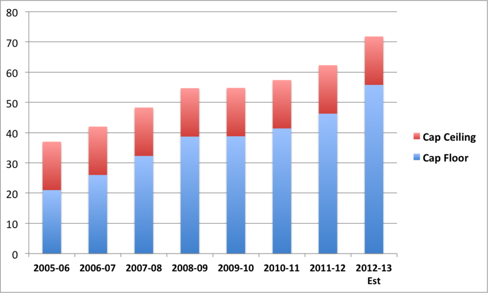 But it’s the estimated salary cap floor of $55.8m $57.8m — now well above the initial ceiling in ’05-06 — that could prove problematic. Ownership groups from a number of smaller-market teams have complained in recent years that franchise revenue hasn’t matched the rapid rise in payroll demands.