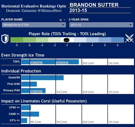 Over the past three years, Sutter has been, at best, mediocre. He spent most of his time centering the third line and stats such as his CorsiFor and CorsiAgainst, as well as his points per 60 minutes of play all point to a player of fourth line caliber. One can also safely safe that his play is likely not worthy of 4-year, $21.875 million extension the Canucks handed Sutter after acquiring him.