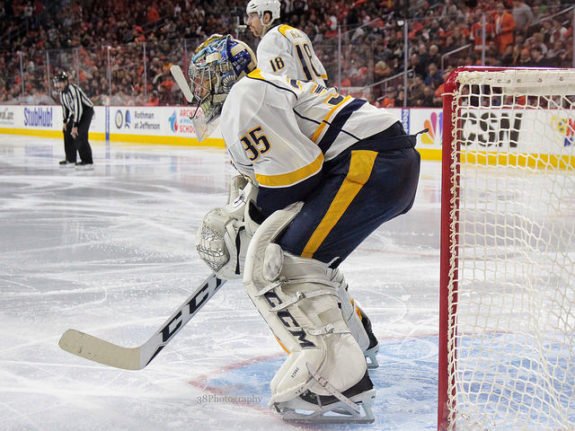 Rinne, pulled at the end of the third period for an extra attacker, finished with seven saves on eleven shots, for a .636 save percentage. At the other end of the rink, winning goaltender Murray made 23 saves on 26 shots, for a .885 save percentage.