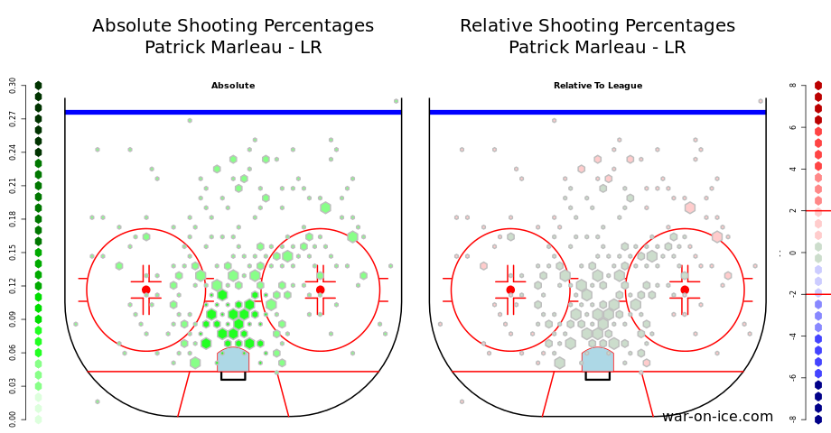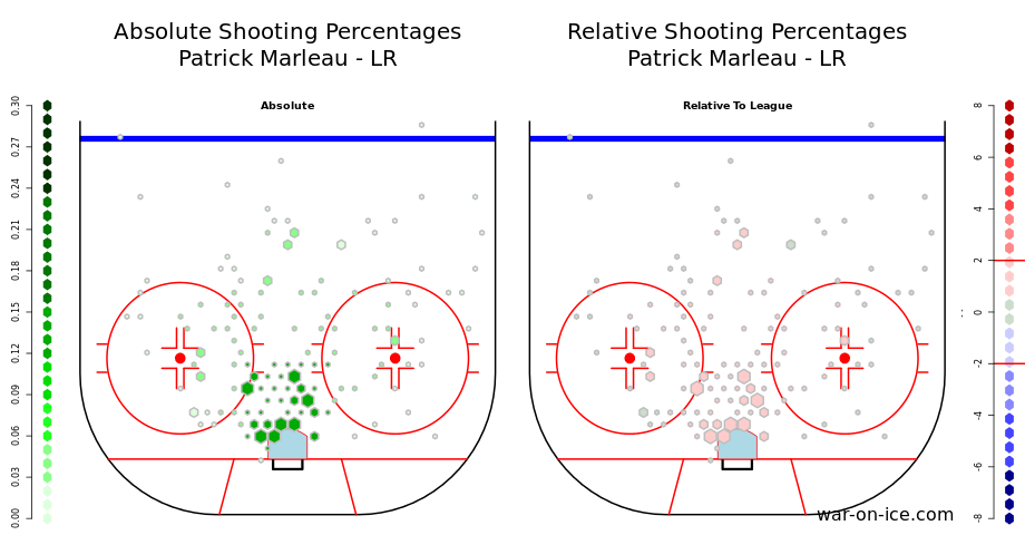 The red on the right chart implies more success scoring goals compared to the league average. Deeper green on the left is Marleau’s absolute scoring. 2 years ago, Patty made a living off scoring in the crease. Mind you, this was the season his percentage was at 11.3.