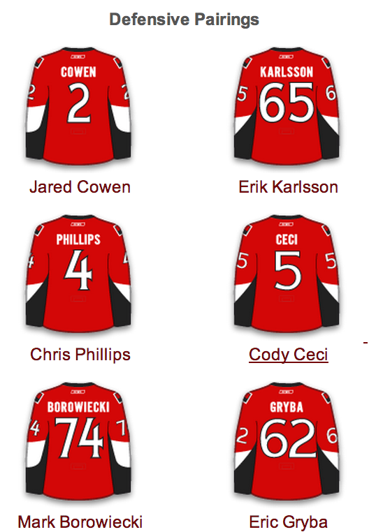 With Marc Methot day-to-day with a back injury, Jared Cowen is being paired with Karlsson in an effort by the coaching staff to not have their first round pick of 2009 not look as bad as he actually is. The third pairing is composed of Eric Gryba and Mark Borowiecki who are nearly identical slow-moving clones who add physicality but next to nothing in terms of offense. Yet, both are drawing starts over Wiercioch.