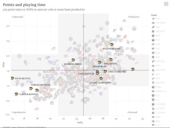 Just how much of an impact has Malkin had on Pittsburgh’s recent surge? Consider the following chart, courtesy of Sean Tierney of The Athletic, which displays players according to their ice time versus production, uncovering who may be overutilized or underutilized. Malkin, as you can see, is being used quite appropriately.
