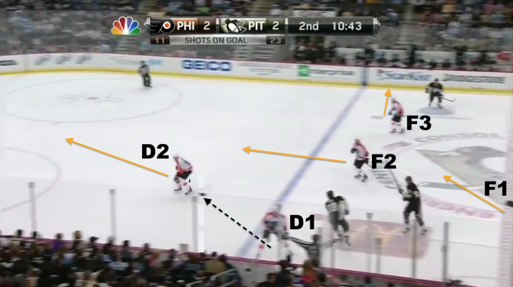 When Pittsburgh has the puck deep in their own end of the ice, the Flyers often pressure the Penguins defensemen hard in an attempt to limit time and space. Wingers take away the easy passes up the boards and force Pittsburgh to work the puck through the middle of the ice.