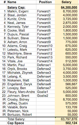 Based on Monday’s cuts, the Penguins are down to 23 active players and sit approximately $500k under the salary cap (players on injured reserve still count against the cap). The CBA dictates that the cap hits of Valabik, Peterson and Bortuzzo are handled uniquely for the time being because the players were injured during training camp. Their cap hits in the chart to the right reflect a pro-rated amount based on time spent at the NHL vs. AHL level last season.