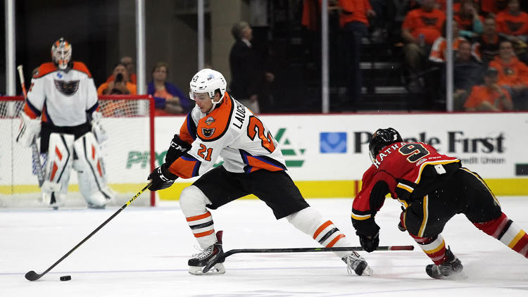 ![Phantoms Center Scott Laughton (21) steals the puck from Flames Forward Garnet Hathaway (9) during second period action Friday at the PPL Center in Allentown. [photo: Chris Knight]](https://thehockeywriters.com/wp-content/uploads/2014/10/Scott-Laughton-Phantoms-300x168.jpeg)