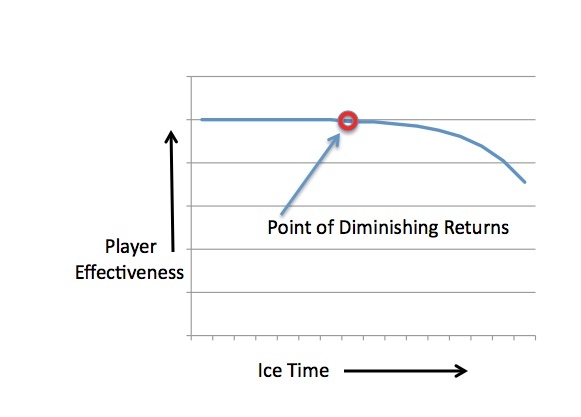 One can manage a player’s ice time to avoid reaching his point of diminishing returns. Diminishing returns can be considered both in the context of a single game and over the course of a season.