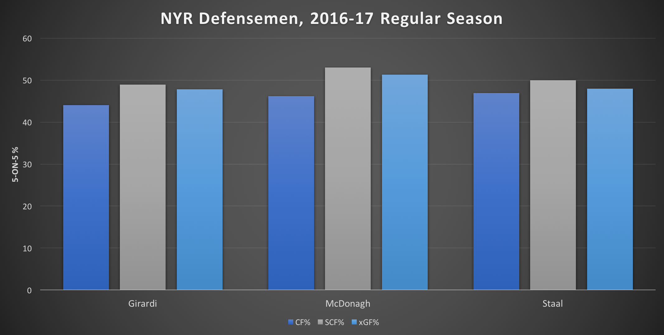 During the regular season, while paired with Girardi, McDonagh still managed lead the defense in five-on-five shots for per 60 (29.56) and expected goals for per 60 (2.7). Additionally, McDonagh’s scoring-chances-for percentage was the second-highest on defense, trailing only Adam Clendening. McDonagh’s scoring chances for per 60 of 9.35 was the third-highest on the defense and his scoring chances against per 60 of 8.28 was the second-lowest. Also impressive was McDonagh’s low goals against per 60 (2.0), which ranked second to Brendan Smith.