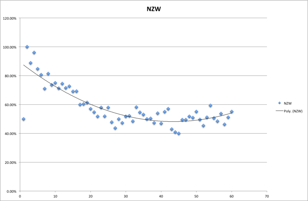 The third and final zone needs to be considered which is both the Neutral Zone Win and Loss. While intuitively it makes sense it is interesting to see there is more of an effect in winning an neutral zone faceoff and losing an offensive zone one. Using the same techniques we find that the corsi data regresses to the normal bands after 20 seconds and league average corsi in this time is 69%.