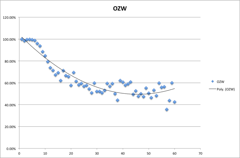 A similar method was used for Offensive Zone Losses and Defensive Zone Wins. This suggests the effects of the faceoff wipe out after 17 seconds and the league average is 56%. The reciprocal is true for Defensive Zone Wins at 44% for 17 seconds.