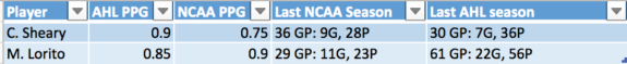 While Sheary got to break into the NHL sooner, with Sidney Crosby and Evgeni Malkin to play with, his AHL and NCAA numbers are quite similar to Lorito. In fact, both were captains of their team in their last collegiate season.