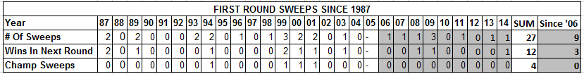 The first round sweep has not guaranteed much success in the way of winning the Stanley Cup either. Only four teams, out of twenty-seven who have swept a team in the first round, since 1987, have gone on to win the Cup.
