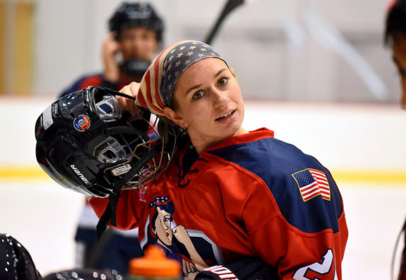 Lauren Wash of the New York Riveters lines up alongside the Boston Pride’s Meghan Duggan before a face-off. (Photo Credit: Troy Parla)