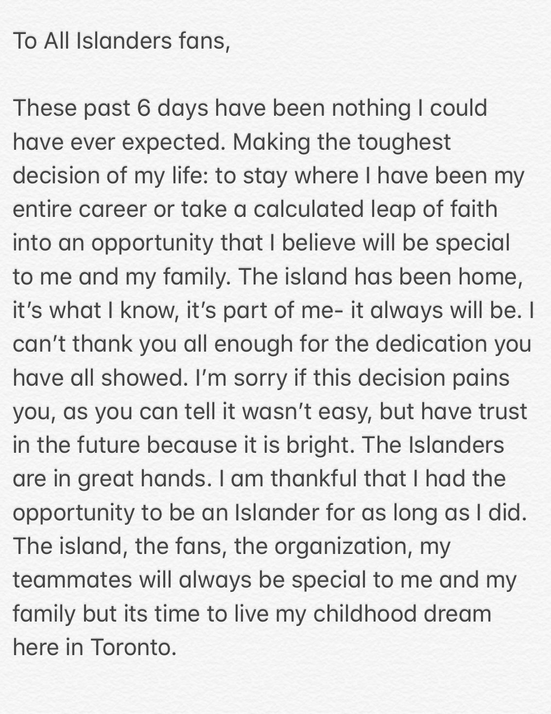 John Tavares has left the New York Islanders and is headed to the Toronto Maple Leafs. The best player to hit unrestricted free agency in a very long time had a list of six teams he considered: the team he played for his first nine seasons, the New York Islanders, and five others. The San Jose Sharks were one of the five. In many respects, the Sharks were a very good fit. But Tavares made the choice, in his own words, “to live his childhood dream.”